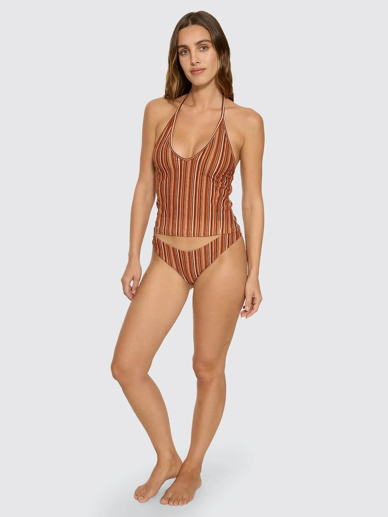 Step into retro summer energy with the Aftersun Stripe Halter Tank in Burnt Orange. With its plunging halter neckline and bold striped print, itÕs the ultimate fusion of sporty and sultry. Cut from recycled nylon with stretch and a soft lining, this tank-inspired women's swimwear au piece is built for comfort while keeping your look loud and confident. A fresh spin on trendy swimwear Australia, itÕs versatile enough for beach days or styled up beyond the surf with denim shorts.
