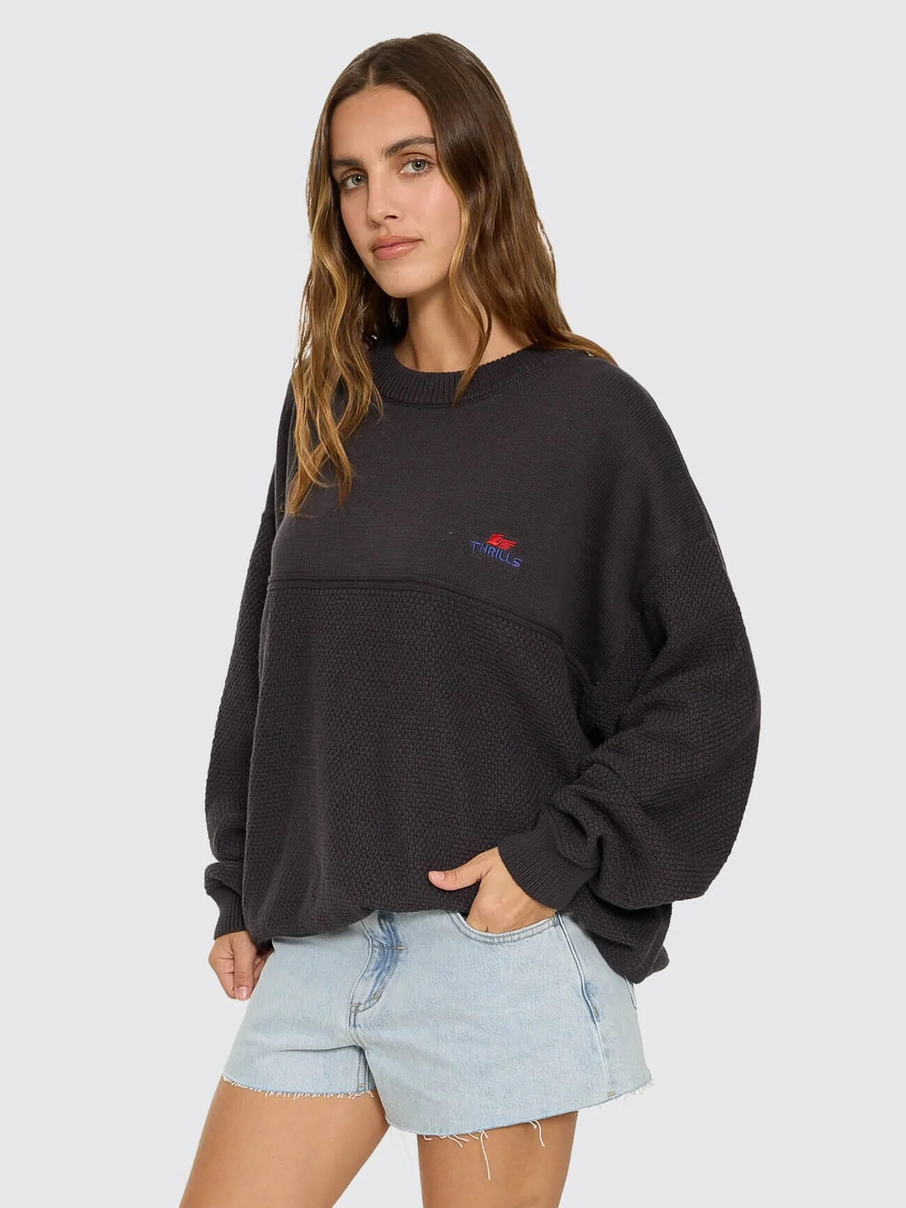 Textured comfort with a streetwise twist, the Navigate Knit Pullover in Dark Charcoal is an Australian women's clothing staple for cooler days and chilly nights. Made from soft 100% cotton yarn, it features a panelled knit structure that adds subtle contrast and depth, plus a slouch, extra-roomy silhouette for that effortless borrowed-from-him vibe. Finished with subtle Thrills embroidery to add just the right amount of detail, this women's pullover is an easy winter layer that works with anything from denim jeans to baggy shorts.